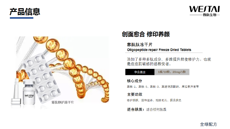 微肽生物研发制造的寡肽修护冻干片通过高活性肽分子的协同作用,深入肌肤底层激活细胞修复机制,加速表皮屏障再生与胶原蛋白合成,有效缓解激光术后、刷酸或敏感引起的泛红、刺痛问题,同时提升肌肤锁水能力,改善干燥脱皮现象,为受损肌提供“急救式”修护。
