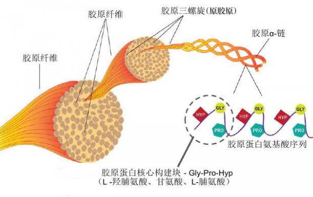 由一系列特定的氨基酸:甘氨酸、脯氨酸和羟脯氨酸按照(Gly-X-Y)n的模式精心排列而成。这种独特的序列不仅赋予了胶原蛋白独特的身份,也是它能够折叠成更高级结构的基础。