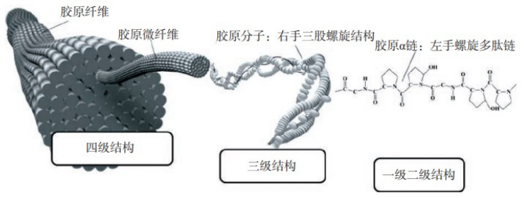 物理机械性能:胶原的三螺旋结构及自身的交联结构,使其具有很高的强度,能在广泛范围内满足机体对机械强度的要求