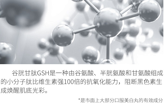 ❑ 谷胱甘肽,抑制黑色素生成、加速其代谢分解,有效减少色斑、提亮肤色,实现美白肌肤的功效。