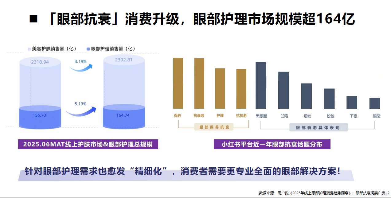 最新数据显示,中国眼部护理市场规模已突破164亿元,年均增长率达18.6%。然而,令人震惊的是,超过90%的眼部产品正在为消费者进行"无效护理"——细纹依旧、黑眼圈未消、浮肿反复。这背后的真相是:传统眼部护理仅停留在表面保湿,未能触及眼周肌肤衰老的核心机制。