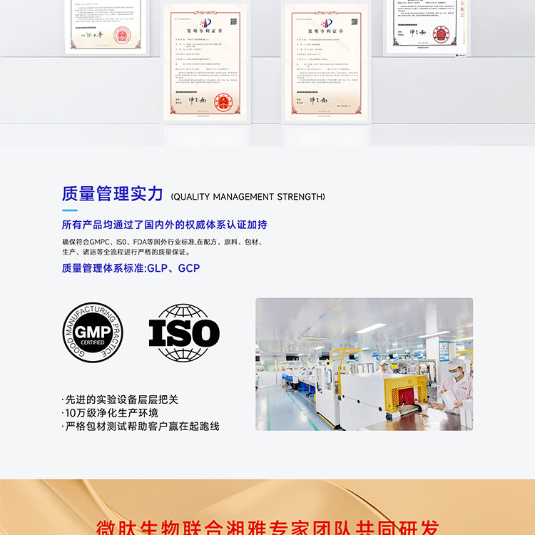 我们不止于生产,更致力于成为品牌的“成长加速器”。通过整合25年化妆品研发经验与全球供应链资源,微肽生物为合作伙伴提供“零门槛入局”解决方案:从原料溯源、功效背书到色彩能量学赋能,打造兼具科学性与情感价值的爆款产品;同时配备柔性生产线与快速响应机制,满足小批量试产到大规模量产的灵活需求。